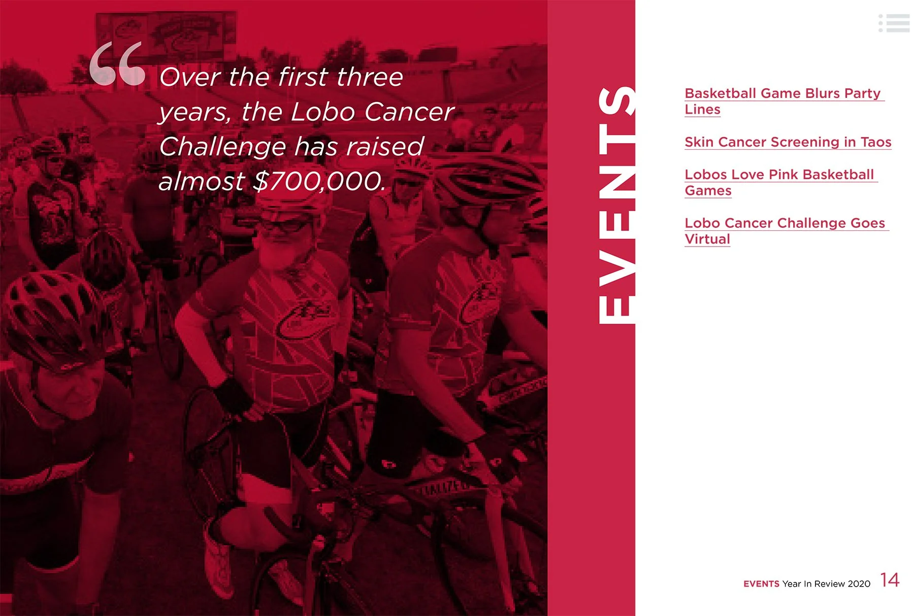 ‘Year In Review’, is a publication created annually for the UNM Comprehensive Cancer Center, published in the first quarter of the following year. It serves to feature notable team members such as scientists, researchers, and other medical professionals who are outstanding and deserve recognition. It is also highlights UNMCCC’s numerous recognitions and annual fundraising events. Below are covers, spreads, and special sections for selected years. The publication, both print and digital, is 56 pages.